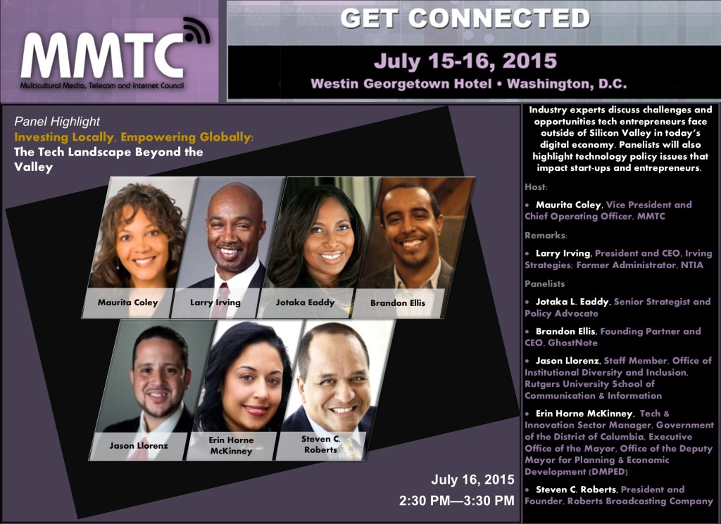 On July 16th, from 2:30 pm to 3:30 pm, industry experts will discuss challenges and opportunities tech entrepreneurs face outside of Silicon Valley in today’s digital economy during the panel “Investing Locally, Empowering Globally: The Tech Landscape Beyond the Valley” at MMTC’s Access to Capital and Telecom Policy Conference. Panelists will also highlight technology policy issues that impact start-ups and entrepreneurs.